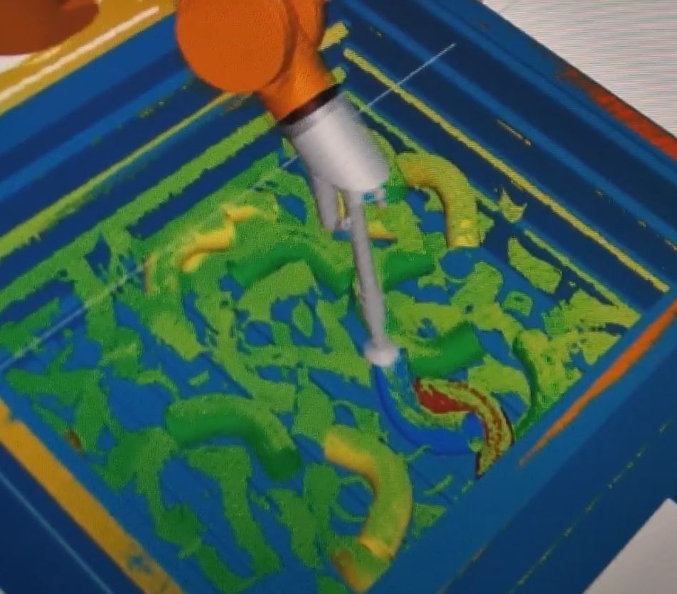 The Bin Picking station includes a 3D scanner by PHOTONEO, which detects the parts inside the container, analyzes which can be picked by the robot, and calculates the trajectories. The robot used is a Stäubli TX2-90L.