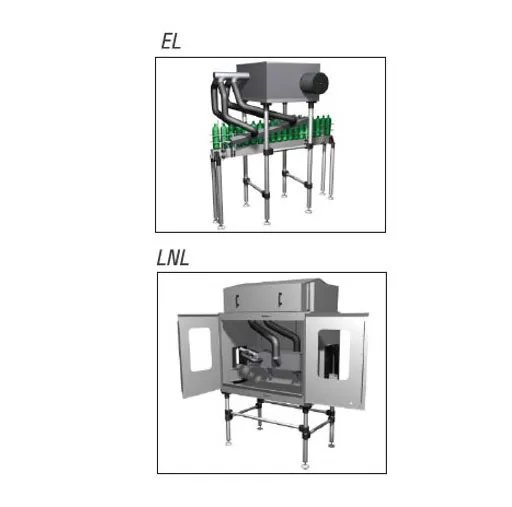 The Bottle Airdyer system, with its exposed motor, allows for quick installation on existing lines. The drying system can be placed on the side of the line, further facilitating rapid installation. Depending on the customer's needs, the systems can be: