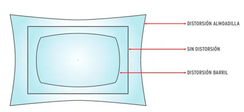 Las distorsiones o aberraciones son el cambio de la representación geométrica de un objeto en el plano de la imagen. Por ejemplo, un rectángulo puede aparecer como una figura geométrica curvada hacia adentro (almohadilla) o hacia fuera (barril).
