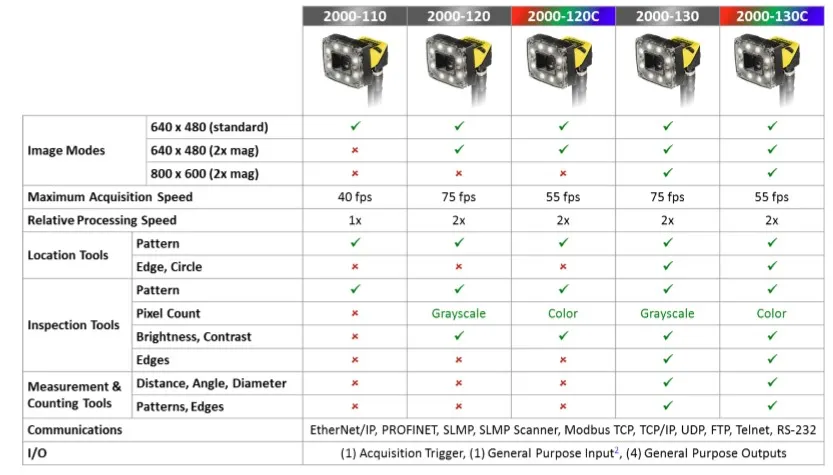 La siguiente tabla muestra más información sobre la gama de modelos de la serie In-Sight 2000: