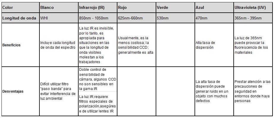 También, es muy importante considerar factores tales como: la geometría de la iluminación, patrón, estructura y otros elementos que pueden influir en la eficacia de la iluminación blanca o coloreada para una aplicación específica. En el siguiente cuadro se muestran los beneficios y los inconvenientes de usar iluminación específica para resolver aplicaciones con su sistema de visión. Un especialista en visión artificial puede ayudarle a determinar la mejor opción de iluminación integrada para su aplicación.