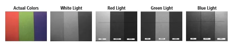 Muchos operadores de sistemas de visión utilizan iluminación de colores para crear un contraste más claro al inspeccionar objetos. Mientras que la iluminación blanca es adecuada para la mayoría de las aplicaciones de visión, la iluminación de colores convierte un sistema de visión ordinario en un sistema de visión más potente. El contraste de imagen más fuerte creado por la iluminación de colores ofrece resultados de inspección más consistentes y precisos. Por ejemplo, la iluminación integrada en rojo o verde permite a los usuarios optimizar el contraste de la imagen y eliminar las influencias de la iluminación de fábrica cuando se utiliza junto con un filtro “paso de banda”. Como se puede ver en la siguiente imagen, los colores rojo, verde y azul se presentan con contraste limitado bajo luz blanca. Sin embargo, cada color es más claramente contrastado cuando se ve con una luz del mismo color. Bajo una luz roja, el rojo aparece blanco. Bajo luz verde, el verde aparece blanco y así sucesivamente. La iluminación de colores hace posible que un sistema de visión inspeccione una mayor variedad de objetos y obtenga resultados más confiables.
