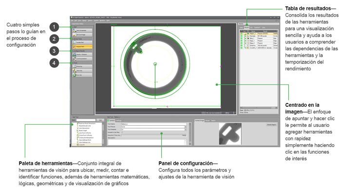 El sistema de visión In-Sight 7000 utiliza la interfaz EasyBuilder® para configurar y controlar las inspecciones de visión artificial. La interfaz intuitiva guía paso a paso al operador a lo largo del proceso de configuración que permite a usuarios principiantes y experimentados configurar aplicaciones de visión en forma rápida y sencilla. Asimismo, el sistema brinda la opción avanzada de hoja de cálculos, la cual otorga flexibilidad en la programación para realizar ajustes fundamentales y también ofrece la garantía de que podrá resolver cualquiera de las aplicaciones de visión. La interfaz de usuario EasyBuilder proporciona pasos intuitivos incluso para las aplicaciones más difíciles. Sin necesidad de programación o hojas de cálculo, las aplicaciones se despliegan a gran velocidad.