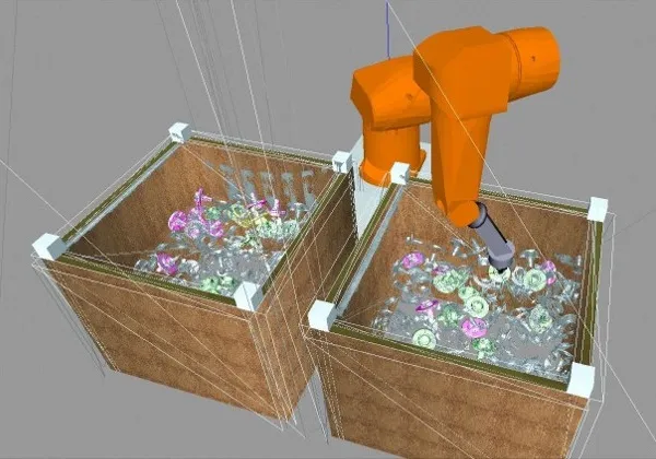 Las aplicaciones Bin Picking integran un sistema de visión artificial para el guiado del robot, capaz de detectar las piezas en entornos desordenados y comunica al robot la posición 3D exacta de las piezas, su orientación y sus dimensiones. El sistema determina qué piezas son manipulables para extraerlas con precisión y el robot realiza la recogida de las piezas sin colisiones en un entorno como palets o contenedores.