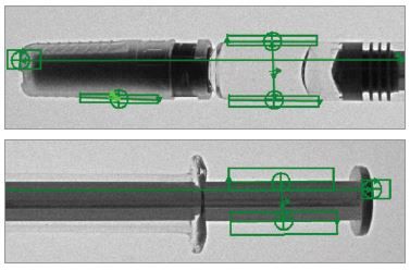 Los sistemas de visión In-Sight 8502P/5P miden la longitud del cilindro, la longitud del émbolo, el grosor de la lengüeta, así como el diámetro interior y exterior del cilindro para garantizar que las jeringuillas cumplen las especificaciones.