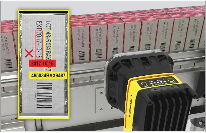La visión Deep Learning lee la información impresa sobre el embalaje y verifica la calidad de los elementos obligatorios, como los logotipos, fecha/información del lote y otros gráficos.