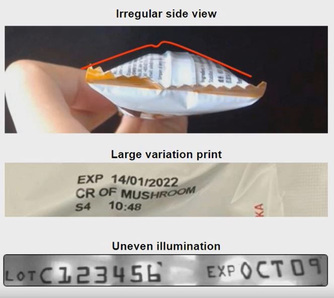 Los envases blandos también son un gran reto para la lectura OCR. La superficie es totalmente irregular y genera brillos con lo que nos encontramos con una gran variabilidad de inconvenientes a la hora de leer códigos alfanuméricos. Hay reflejos, brillos, y debido a la irregularidad en la superficie se generan en el marcaje movimientos, caracteres muy pegados o sesgados y la iluminación siempre es muy irregular por los propios reflejos que genera la superficie.