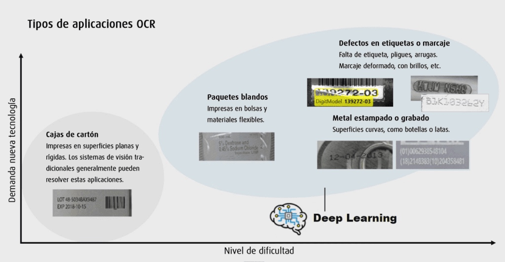 ¿Tienes problemas para leer códigos con OCR de manera fiable utilizando métodos tradicionales de visión artificial?? ¿La superficie por la que debes de leer es complicada, paquetes blandos, metales grabados, botellas transparentes que tienen muchos brillos o incluso la etiqueta está rota o mal colocada? A continuación, te explicamos todo lo que debes saber sobre la lectura OCR, qué es, los tipos de marcajes y materiales y la nueva tecnología de lectura OCR basada en Deep Learning o aprendizaje profundo dará solución a todas estas problemáticas.
