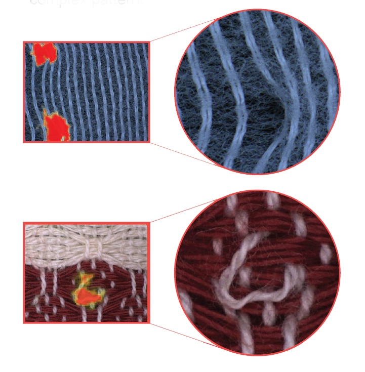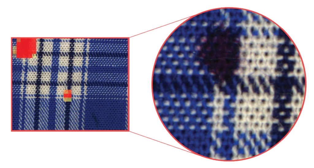 La visión basada en Deep Learning identifica un hilo roto en el tejido a pesar de tener patrones complejos.