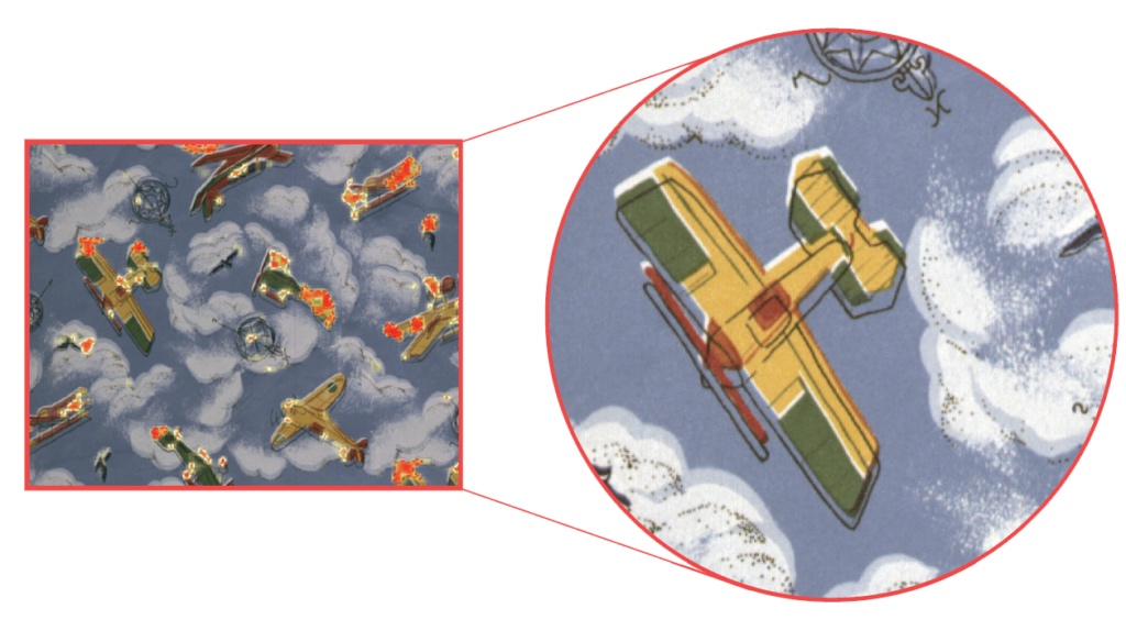 La visión basada en Deep Learning permite la inspección de telas impresas. Es capaz de identificar problemas en la impresión, como la desalineación de diferentes canales de color (contorno negro frente al relleno), aún con imágenes complejas.