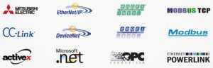 - Protocolos industriales de Ethernet, como EtherNet/IP, PROFINET, Protocolo MC, POWERLINK, Modbus TCP. Estos protocolos permiten vincular los sistemas de visión con los PLC más conocidos y otros dispositivos mediante un único cable de Ethernet, lo que elimina la necesidad de complejos esquemas de cableado y puertos de enlace de red costosos.