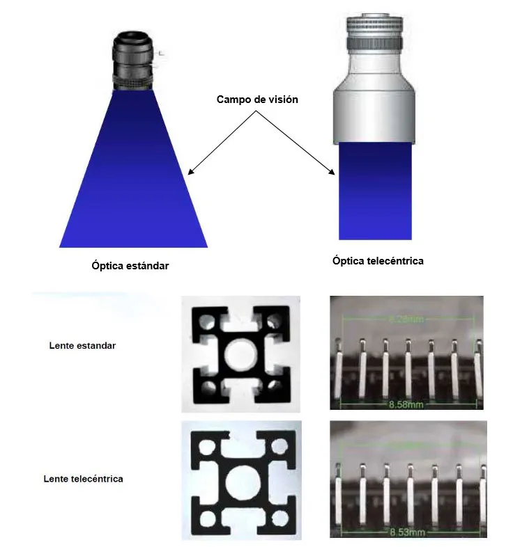 Dependiendo de la forma geométrica del objeto a analizar podemos tener problemas con las mediciones del mismo ya que las ópticas estándares se ven afectadas por el ángulo de adquisición de la imagen. Para solucionar este problema existen ópticas telecéntricas con las que se asegura una visión totalmente paralela de los objetos a analizar.