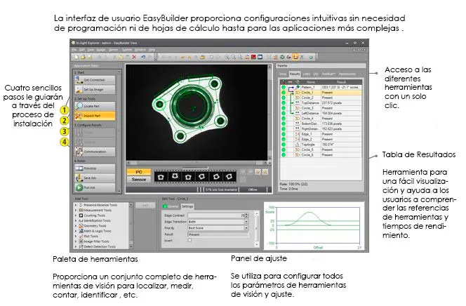 Diseñada para facilitar el uso de la visión artificial en cualquier empresa y en cualquier proceso industrial, esta interfaz es excelente para los usuarios de visión noveles y operadores de línea ya que EasyBuilder no requiere aprender a programar, lo que permite utilizar y ejecutar la aplicación en poco tiempo.