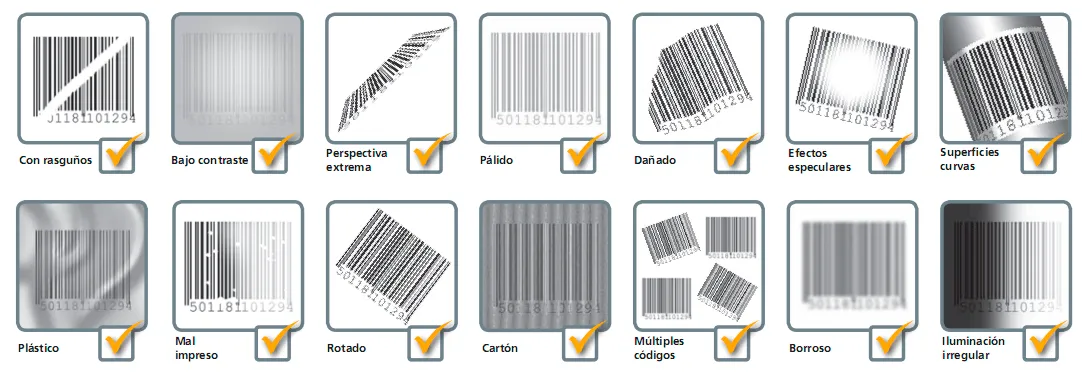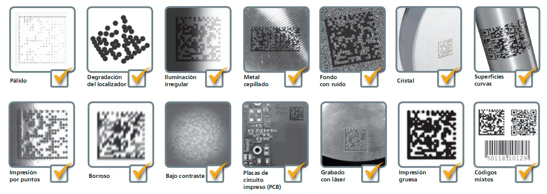 Le tecnología 2DMax™ está optimizada para la lectura de códigos QR y administra una amplia gama de degradaciones en el aspecto de los códigos 2-D Data Matrix que se presentan como consecuencia de las drásticas degradaciones en la calidad del código de marcación directa de piezas (DPM), dadas las diferentes superficies y los tipos de materiales, que incluyen: