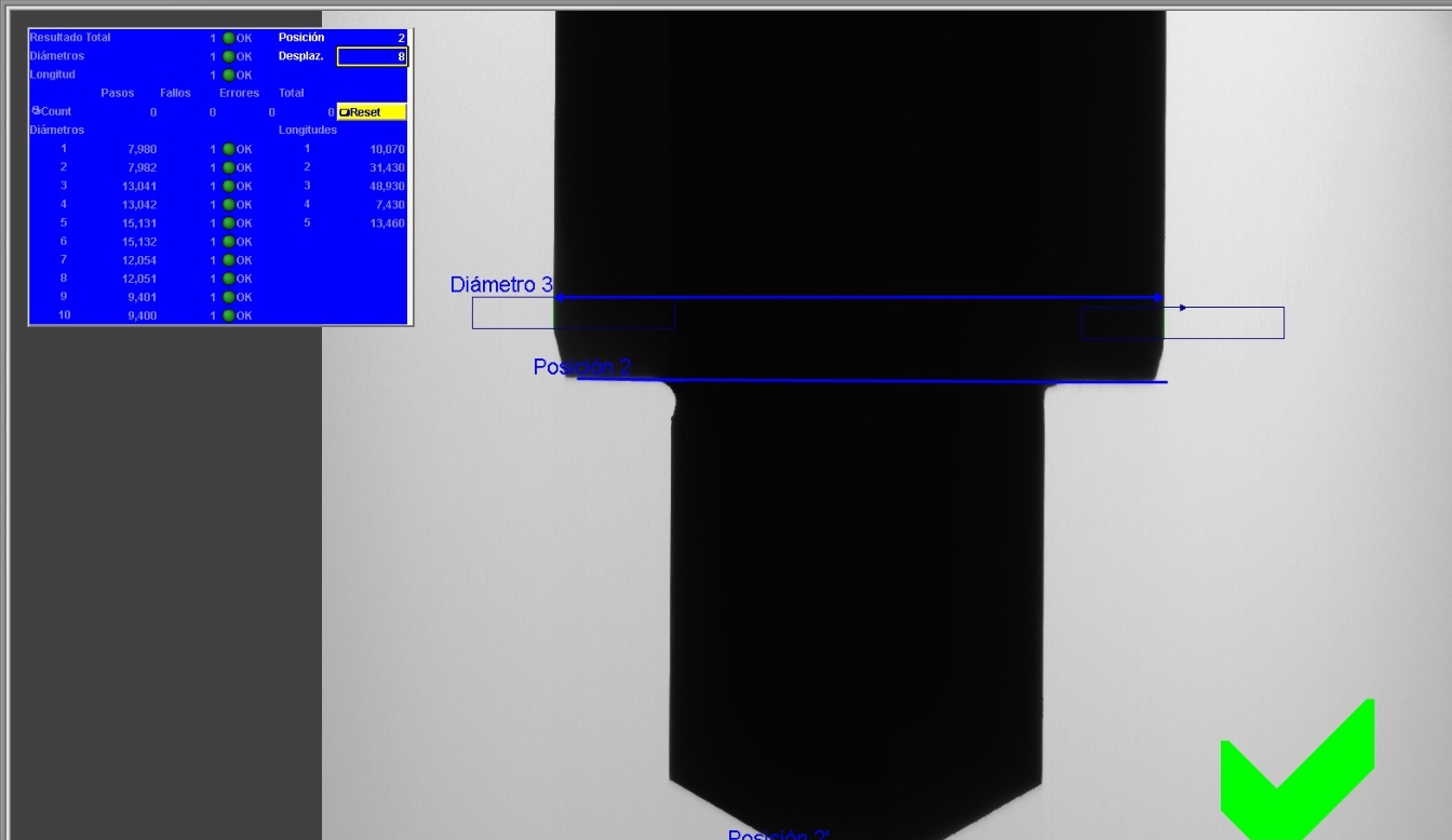 El objetivo de la aplicación es medir con gran precisión  las longitudes y diámetros de una pieza de revolución. Aplicación de visión artificial desarrollada para el sector del metal-decoletaje.