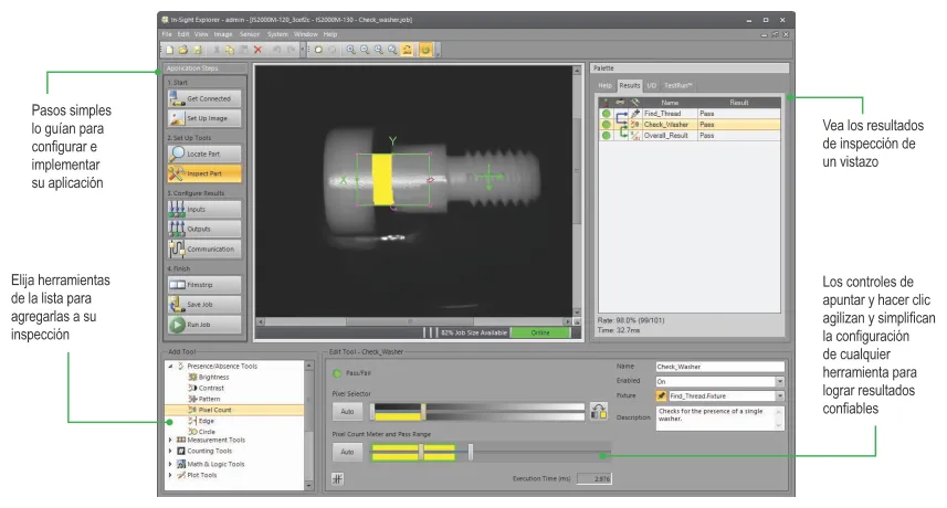 La interfaz de configuración de EasyBuilder es ideal para resolver inspecciones simples de presencia/ausencia. Se pueden lograr inspecciones básicas de aprobado/fallo con herramientas de configuración sencilla. En caso de inspecciones más complejas, los usuarios pueden basarse en su experiencia para crear aplicaciones de visión mediante el uso de los sistemas de visión In-Sight más avanzados, en la misma interfaz de In‑Sight Explorer.