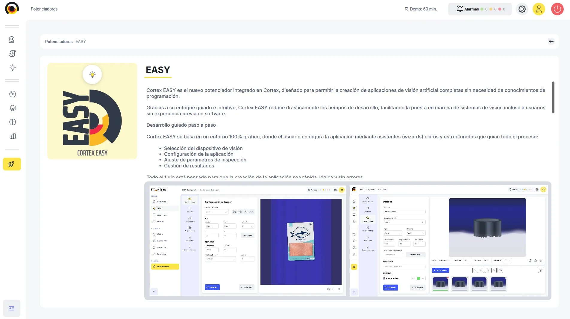 Cortex 3.0 incorpora las herramientas Easy, diseñadas para que cualquier técnico pueda implementar aplicaciones de visión de forma rápida, guiada y segura sin necesidades de tener conocimientos de programación.